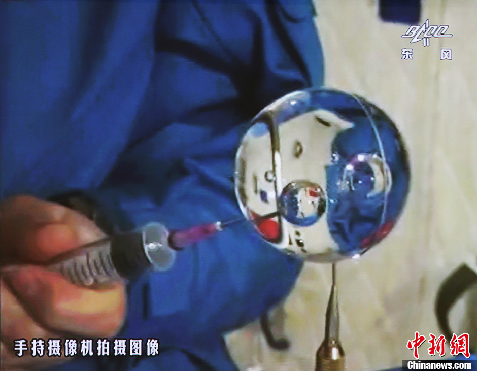 6月20日10時許,神舟十號航天員在天宮一號開展基礎(chǔ)物理實驗,為青少年進行中國首次太空授課。圖為王亞平講授太空失重提供條件下的水球演示。中新社發(fā) 秦憲安 攝