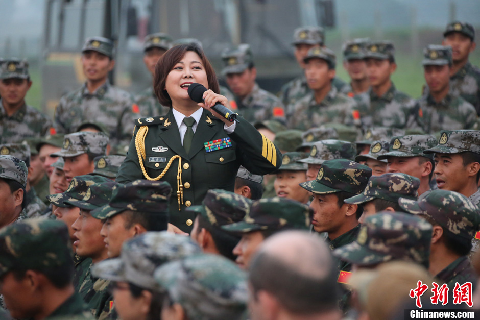 8月10日,隨同中方參演部隊赴俄羅斯參加“和平使命-2013”中俄聯演的沈陽軍區政治部文工團演員們,為中俄千余名參演官兵獻上了一場精彩的文藝晚會。豐富多彩的文藝節目,將位于切巴爾庫爾訓練場的中俄聯演野營村,變成了友誼的盛會、歡樂的海洋。 圖為演唱歌曲《當那一天來臨》。中新社發 李祥輝 攝