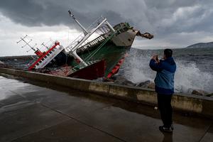 當地時間11月30日,土耳其伊斯坦布爾,強風掠過海岸掀起大浪,路人拍攝船只傾覆。