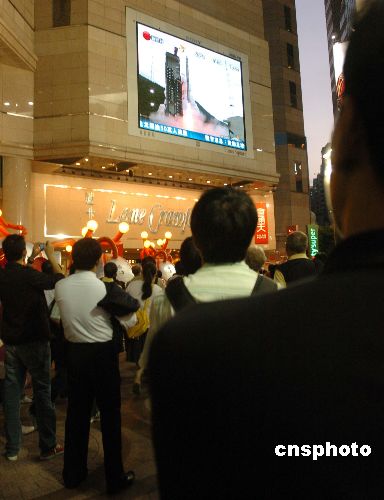 10月24日,中國首枚探月衛星“嫦娥一號”于傍晚6時05分在四川西昌衛星發射中心發射場順利升空。圖為香港市民在時代廣場駐足觀看電視直播“嫦娥一號”發射升空一刻。中新社發 鄧慶樂 攝