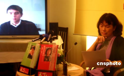 臺灣作家龍應臺與長子安德烈(圖左)的三十六封家書在臺北輯錄出版。圖為在香港大學就讀經濟系、有德國血統的安德烈,以視訊方式參與十一月七日下午于臺北舉辦的一場茶會。龍應臺表示,兩代人之間也要尋找方法,開一扇溝通之門。中新社發 劉舒凌 攝
