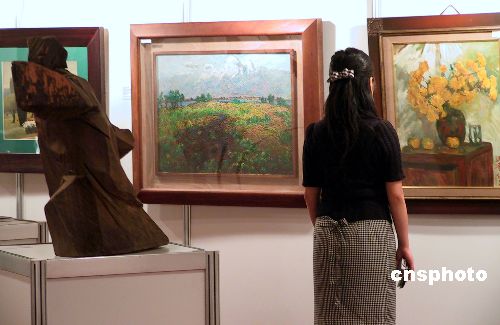 十一月十二日,現代中國藝術家張大千、吳冠中、范曾以及臺灣雕塑大師朱銘等人作品在臺北展出,這些作品將出現在本月下旬香港一家藝術品拍賣公司邦瀚斯舉辦的秋季拍賣會上。圖為臺北市民觀摩藝術品。中新社發 劉舒凌 攝