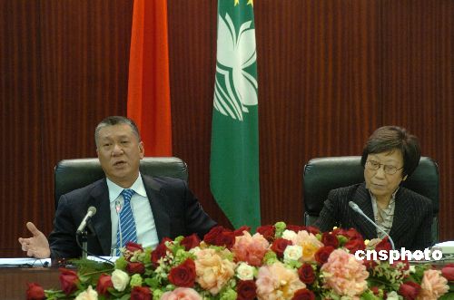 十一月十四日,澳門特首何厚鏵在立法會就特區政府2008年財政年度施政報告的內容回答議員們的發問。右為澳門立法會主席曹其真。中新社發 史利 攝