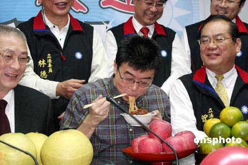 圖為邱毅從坐牢地點高雄到臺北后,返回“立法院”,同黨“立委”依習俗送上柚子、蘋果及橘子,分別代表“保佑、平安及吉利”,并端上一碗豬腳面線,希望幫邱毅去掉霉氣并補壽。