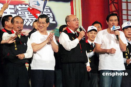 11月24日,中國(guó)國(guó)民黨在臺(tái)灣中部的嘉義市舉行萬(wàn)人造勢(shì)活動(dòng),紀(jì)念該黨成立一百一十三周年,也為明年臺(tái)灣的兩次重要選舉拉抬聲勢(shì)。圖為馬英九、蕭萬(wàn)長(zhǎng)、吳伯雄、王金平等全體與會(huì)者高唱《我們都是一家人》、《愛拚才會(huì)贏》等歌。整個(gè)造勢(shì)活動(dòng)突出“拚經(jīng)濟(jì)、顧生活”的訴求和“以臺(tái)灣為主,對(duì)人民有利”的主題。中新社發(fā) 黃少華 攝
