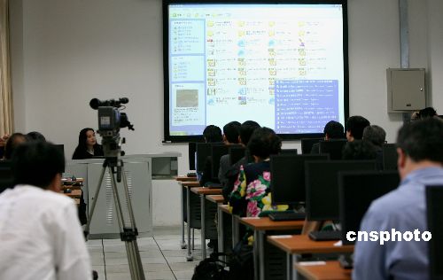 十一月二十九日,中國人民大學新聞學院副院長彭蘭,在該院為“第三期海外華文媒體高級研修班”學員做題為“網絡與新媒體技術”專題講座。中新社發 張勤 攝