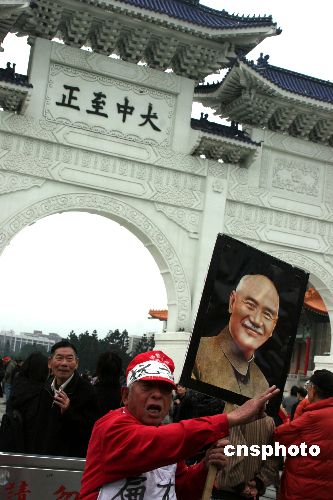 十二月五日,因臺(tái)灣教育部門執(zhí)意拆除臺(tái)北“中正紀(jì)念堂”牌樓“大中至正”四字引發(fā)的風(fēng)波升級(jí),反對(duì)者與支持者在現(xiàn)場(chǎng)爆發(fā)數(shù)波沖突。圖為一位老者舉著蔣介石畫像,對(duì)當(dāng)局將要拆牌表達(dá)強(qiáng)烈抗議。中新社發(fā) 董會(huì)峰 攝
