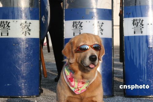 十二月六日,臺北“中正紀念館”在爭議聲中開始封館,“大中至正”牌樓將要拆除。圖為一只被主人戴上墨鏡的狗站在警察人墻前,成為媒體拍照“明星”。中新社發 董會峰 攝