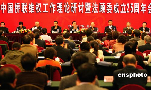 12月8日至9日,中國僑聯(lián)維權(quán)工作理論研討暨紀念法顧委成立25周年會議在北京召開,會議表彰了近五年來各地僑聯(lián)維權(quán)工作先進單位和個人。會議就建立維權(quán)長效機制,切實維護歸僑僑眷和海外僑胞在國內(nèi)的合法權(quán)利和利益進行理論研討。中國僑聯(lián)法顧委是1982年5月6日成立的中國僑聯(lián)高層法律服務(wù)顧問機構(gòu)。中新社發(fā) 張勤 攝