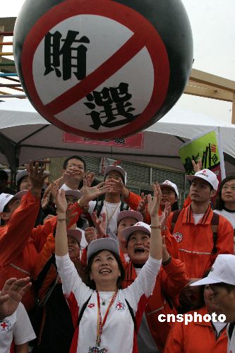 圖為參與者將禁止賄選的大氣球拋向空中。