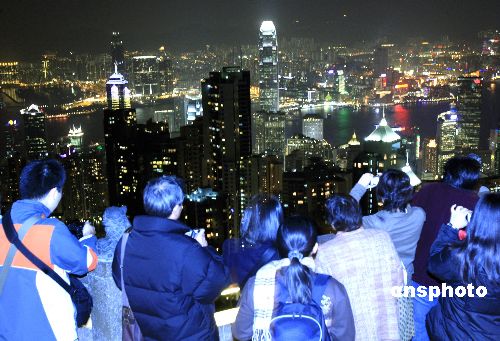 眾多游客和市民在香港太平山頂觀看璀燦夜色,等待時光邁入2008年。中新社發 王麗南 攝