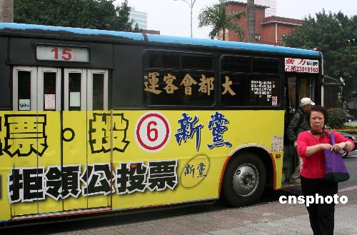 一月九日,距臺灣第七屆“立委”選舉只有三天,選情緊繃。圖為臺北市十五路公交車上新黨刊登的號召選民“拒領公投票”的競選廣告。中新社發 陳立宇 攝