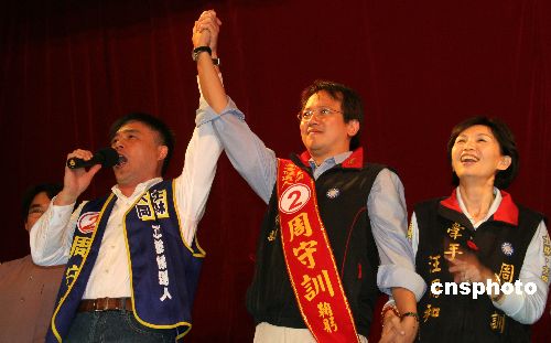一月十日晚,臺(tái)北市市長(zhǎng)郝龍斌參加“立委”候選人周守訓(xùn)拉票造勢(shì)晚會(huì),為周參選站臺(tái)、打氣。臺(tái)灣“立委”選舉在即,選戰(zhàn)已進(jìn)入白熱化。中新社發(fā) 孫自法 攝