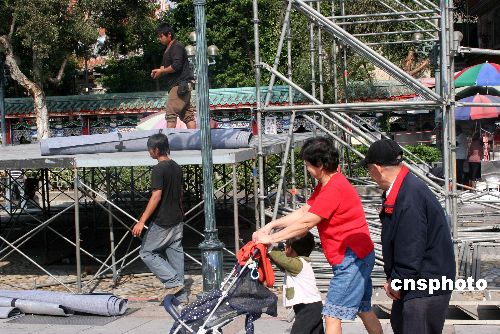 一月十一日,距臺灣“立委”選舉投票日只有一天。從中午開始,臺北市龍山寺前,工人在趕搭臨時舞臺,準備供候選人晚上造勢,作最后沖刺。中新社發 陳立宇 攝