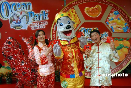 一月十七日,香港海洋公園吉祥物威威獅令以新春唐衫裝扮大派新年利是,宣傳賀歲活動(dòng)。當(dāng)日,該公園宣布由二月二日至十七日農(nóng)歷期間舉辦“大團(tuán)拜”,上演“冰上百老匯”、“舞龍大匯演”等迎鼠接福活動(dòng)。中新社發(fā) 蔡蔓莉 攝