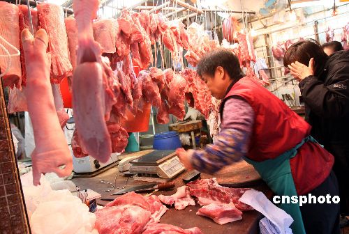 一月二十九日,香港市民在街市選購新鮮豬肉。臨近春節,各類供港食品受內地大風雪影響價格上漲,豬肉零售價再次飆升至每斤四十至四十四元。香港食物及衛生局局長周一岳表示,中央已采取緊急調配措施,務求把內地大風雪對供港食品的影響減至最低。中新社發 洪少葵 攝