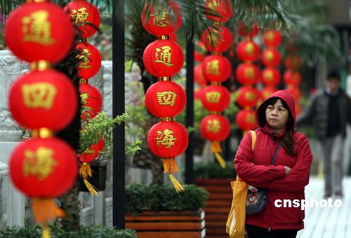 一月三十一日,一位香港市民走過街頭大紅的新春裝飾。當日,香港天文臺表示,今早錄得的最低氣溫為八點五度,是入冬以來的最低紀錄。中新社發 武仲林 攝