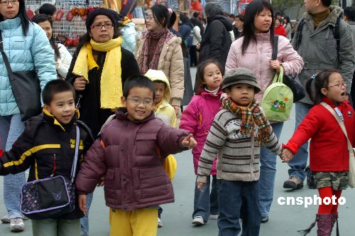 二月一日,香港天氣持續寒冷,小朋友外出均穿上厚厚的御寒衣物。中新社發 譚達明 攝