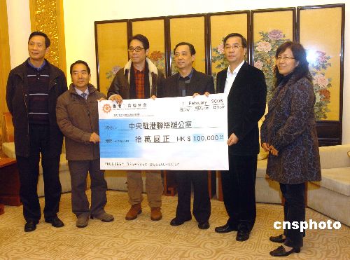 二月一日,香港工會聯合會(工聯會)理事長黃國建(左三)、副會長梁富華(左二)前往中央人民政府駐香港特別行政區聯絡辦公室(中聯辦),遞交港幣十萬元支票,救濟內地雪災受災省區。中新社發 鄧慶樂 攝