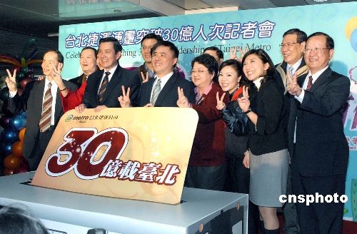 臺北市捷運運量累計突破三十億人次。圖為三日下午臺北捷運臺北車站內,臺北市前任市長馬英九、現任市長郝龍斌等參加慶祝記者會。中新社發 曾嘉 攝