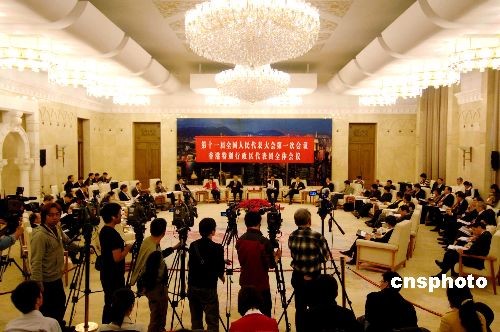 三月五日下午,十一屆全國人大一次會(huì)議香港特區(qū)代表團(tuán),在北京人民大會(huì)堂香港廳舉行全體會(huì)議,審議溫家寶所作的政府工作報(bào)告。眾多媒體現(xiàn)場(chǎng)進(jìn)行采訪。中新社發(fā) 王東明 攝