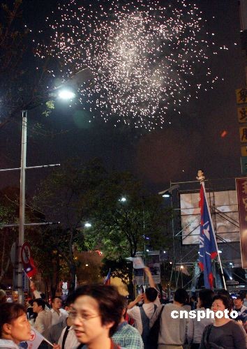3月22日,中國國民黨候選人馬英九、蕭萬長在臺灣地區領導人大選中以221萬票的領先優勢獲勝。圖為當日晚間在馬蕭競選總部前的集會上,支持者放焰火慶祝。中新社發 黃少華 攝