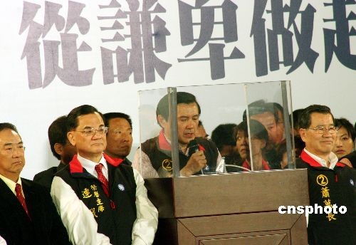 3月22日,臺(tái)灣舉行大選投票,結(jié)果中國國民黨候選人馬英九、蕭萬長以221萬票的領(lǐng)先優(yōu)勢獲勝,當(dāng)晚大批支持者在馬蕭競選總部前集會(huì)歡慶。圖為馬英九在蕭萬長、國民黨榮譽(yù)主席連戰(zhàn)、主席吳伯雄、親民黨主席宋楚瑜、“立法院長”王金平陪同下,在現(xiàn)場發(fā)表演講。中新社發(fā) 黃少華 攝