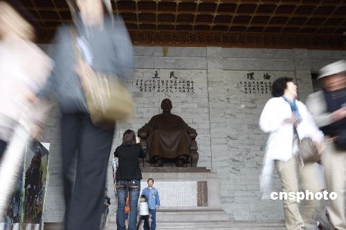 4月1日,因更名引發(fā)爭(zhēng)議的臺(tái)北“中正紀(jì)念堂”蔣介石銅像大廳懸掛的風(fēng)箏已經(jīng)拆除,目前剩下大廳中央的鋼架以及兩側(cè)的布幕尚未撤除。圖為游客參觀“中正紀(jì)念堂”蔣介石銅像大廳。中新社發(fā) 杜洋 攝