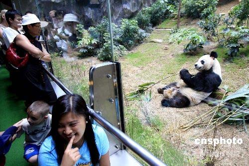 四月二十六日是大熊貓盈盈及樂(lè)樂(lè)到港一周年紀(jì)念日,香港海洋公園將于四月二十六日至五月三十一日推出“尋找熊盈樂(lè)”香港身份證推廣優(yōu)惠活動(dòng)。凡身份證或出生證明書(shū)上的名字印有“熊”、“盈”、“樂(lè)”或“P 、A 、N 、D、 A”的其中一個(gè)字母,即可享有購(gòu)海洋公園日間入場(chǎng)門券八折優(yōu)惠,并有十人獲得雙人探訪“四川大熊貓基地”之旅。圖為二十二日游人在海洋公園觀賞大熊貓憨態(tài)可掬的吃竹子。中新社發(fā) 王麗南 攝