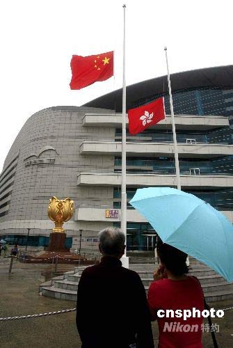五月十九日,全國哀悼日,香港金紫荊廣場降半旗向四川大地震死難者致哀。中新社發(fā) 王麗南 攝