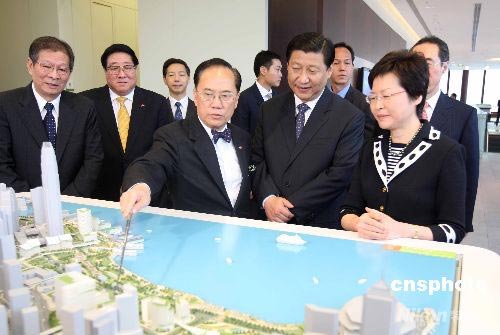 七月七日,首次訪問香港的國家副主席習近平,來到金融管理局參觀貨幣及銀行體系展覽,同時了解港粵、港深合作情況。中新社發 任海霞 攝