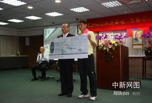 臺灣土地銀行27日舉行歡迎在北京奧運會上打進羽毛球男單八強,并列第五名的中華臺北隊隊員謝裕興返臺表揚會。謝裕興大學三年級時加入土地銀行羽毛球隊。圖為臺灣土地銀行董事長吳繁治向謝裕興(右一)頒發獎金,以資鼓勵。作者 陳立宇