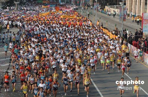 十月一日上午八時(shí)許,澳門(mén)各界民眾參加的“國(guó)慶歡樂(lè)跑”在金蓮花廣場(chǎng)啟動(dòng)!皻g樂(lè)跑”是澳門(mén)國(guó)慶日一項(xiàng)傳統(tǒng)民間體育活動(dòng)。中新社發(fā) 畢永光 攝