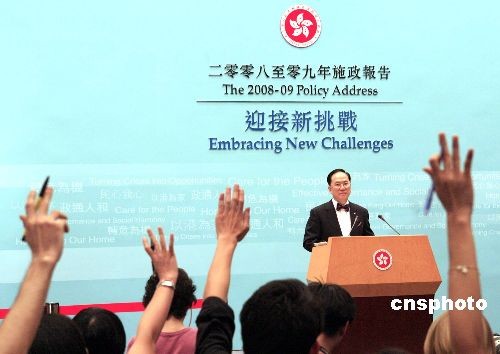 十月十五日,香港特區(qū)行政長(zhǎng)官曾蔭權(quán)向立法會(huì)發(fā)表二零零八至零九年施政報(bào)告后于下午二時(shí)三十分在中環(huán)政府一樓會(huì)議廳舉行舉行記者會(huì)。圖為香港行政長(zhǎng)官曾蔭權(quán)正在回答記者提問(wèn)。中新社發(fā) 張勤 攝