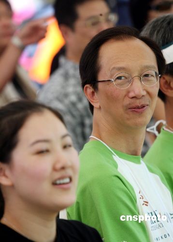 十月二十五日,國(guó)際小母牛香港分會(huì)董事局主席梁錦松、小母牛組織愛心大使伏明霞在香港維多利亞公園出席小母牛“競(jìng)步善行二零零八”慈善比賽,為四川災(zāi)區(qū)重建工作籌款。中新社發(fā) 武仲林 攝