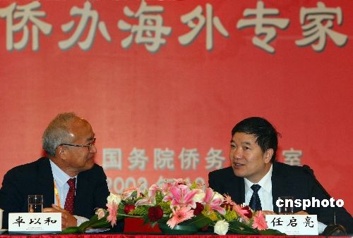 10月27日,第二屆國務(wù)院僑辦海外專家咨詢委員會會議在北京舉行。圖為國務(wù)院僑務(wù)辦公室副主任任啟亮(右)與華裔美籍電機(jī)工程學(xué)家卓以和(左)在會上交流。中新社發(fā) 廖文靜 攝