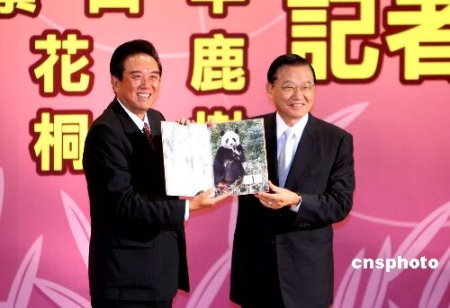 十一月六日上午,海協(xié)會(huì)會(huì)長(zhǎng)陳云林與海基會(huì)董事長(zhǎng)江丙坤在臺(tái)北圓山飯店出席”兩岸互贈(zèng)大熊貓、長(zhǎng)鬃山羊、梅花鹿、珙桐樹儀式”。中新社發(fā) 洪少葵 攝