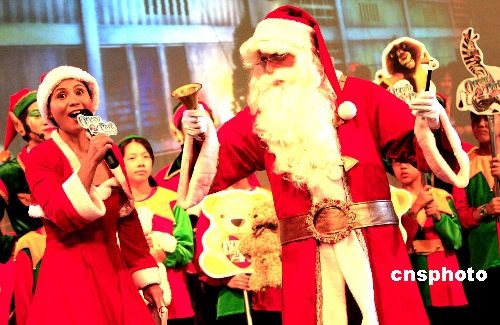 十二月十二日至二零零九年一月四日,香港海洋公園圣誕全城ho ho ho 2008 將為游人帶來一連串節日驚喜。圖為海洋公園主席盛智文扮裝圣誕老人為圣誕節揭開序幕。中新社發 張勤 攝