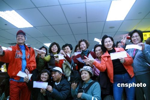 12月15日上午,臺灣復興航空332號航班從臺北松山機場起飛前往上海,這是從臺灣飛出的首個兩岸平日包機航班。登機前,部分乘客合影留念,見證這歷史性的一刻。中新社發 周兆軍 攝