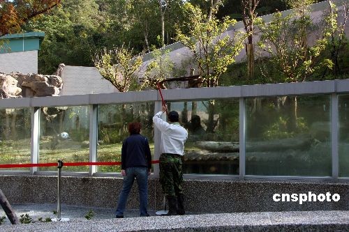 12月18日上午,臺北市動物園進行“游客參觀大貓熊動線測試”演練,檢驗動物園方面目前所規劃的館內教育展示解說、游客流量、流速及動線順暢度。圖為工人在為“團團”、“圓圓”新家做護墻保潔。中新社發 劉舒凌 攝