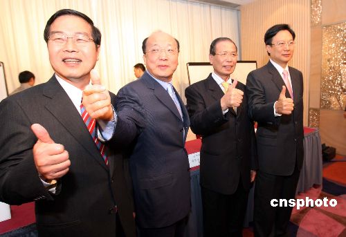 一月七日,臺灣臺中市長胡志強(左二)、臺中縣長黃仲生(右二)、彰化縣長卓柏源(右)、南投縣長李朝卿在香港舉行記者會,向港澳媒體行銷臺灣人文景觀和旅游資源。中新社發 洪少葵 攝