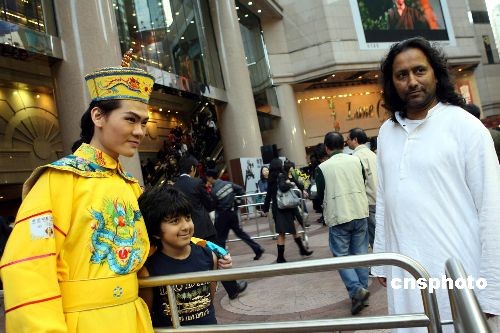 二月十九日,“香港電影百年展”在時(shí)代廣場(chǎng)舉行,展覽內(nèi)容包括香港電影業(yè)百年間的發(fā)展歷史、早期的電影海報(bào)、明星相及廣告。圖為古裝扮相的演員與游客同樂(lè)。中新社發(fā) 洪少葵 攝
