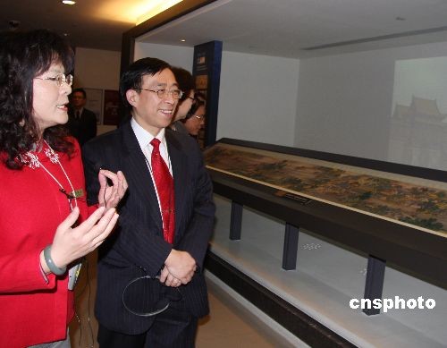 2月26日,上海博物館館長陳燮君(中)一行應邀抵達臺北參訪。圖為陳燮君一行在臺北故宮參觀,聽工作人員介紹結合了聲光效果的《清明上河圖》復制品。中新社發(fā) 路梅 攝