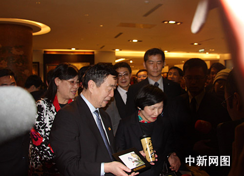 3月1日中午,回訪臺(tái)北故宮博物院的北京故宮博物院院長(zhǎng)鄭欣淼一行抵達(dá)臺(tái)北,下午即到臺(tái)北故宮博物院參訪。圖為參觀禮品部時(shí),臺(tái)北故宮博物院院長(zhǎng)周功鑫向鄭欣淼(左二)一行致贈(zèng)禮品。陳立宇 攝