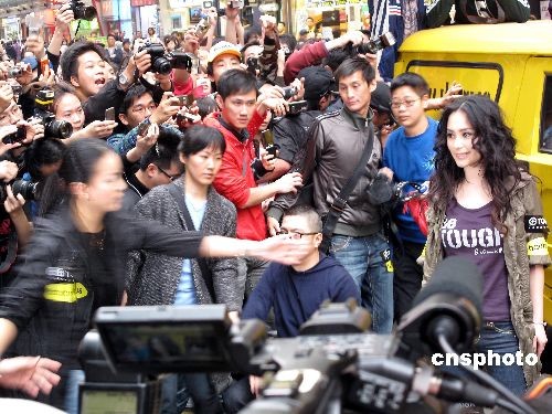 三月十一日,藝人不雅照女主角之一的鐘欣桐(阿嬌)復出后首次現身香港鬧市街頭,引來數百人圍觀,爭相拍攝。阿嬌復出后首份工作是擔任一個牛仔褲品牌的代言人,當日出席該品牌一分店的宣傳活動。中新社發 黎金良 攝