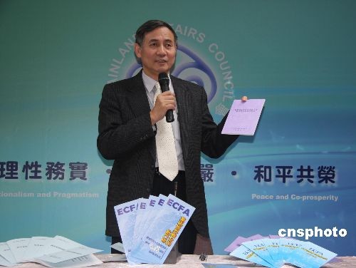 四月七日下午,臺灣“陸委會(huì)”召開臨時(shí)記者會(huì),推介《兩岸會(huì)談相關(guān)政策說明》、《ECFA兩岸經(jīng)濟(jì)合作架構(gòu)協(xié)議政策說明》兩種新印發(fā)的宣傳手冊,為即將舉行的第三次“陳江會(huì)談”創(chuàng)造積極的輿論氛圍。“陸委會(huì)”副主委劉德勛主持記者會(huì),對兩本宣傳手冊做介紹說明。中新社發(fā) 耿軍 攝