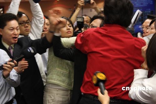 四月二十二日上午,臺灣“立法院內(nèi)政委員會”邀請“陸委會”主委賴幸媛、海基會秘書長高孔廉等人報告即將舉行的第三次“陳江會談”。據(jù)臺灣中央社報道:中國國民黨籍“立委”李慶華在進(jìn)行程序發(fā)言時,民進(jìn)黨籍“立委”邱議瑩在臺下表達(dá)不滿意見,引發(fā)李慶華不滿,要邱議瑩“有點(diǎn)家教”,邱議瑩(左四穿白衣女性)與李慶華(穿紅衣男性)爆發(fā)口角,并突然從后面打李慶華一巴掌。李慶華下午到臺北地檢署,按鈴控告邱議瑩傷害及公然侮辱罪。圖為本社記者在“立法院”采訪時拍攝到的情景。中新社發(fā) 耿軍 攝