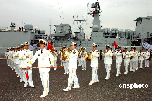 圖:中國海軍軍樂團在訪日艦艇前列隊表演