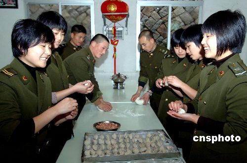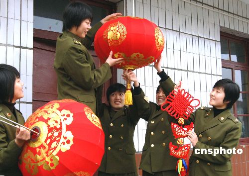 2月5日,駐閩某部女兵在軍營營房前高掛大紅燈籠,在軍營食堂包餃子,喜迎新春佳節的到來。中新社發 劉可耕 攝