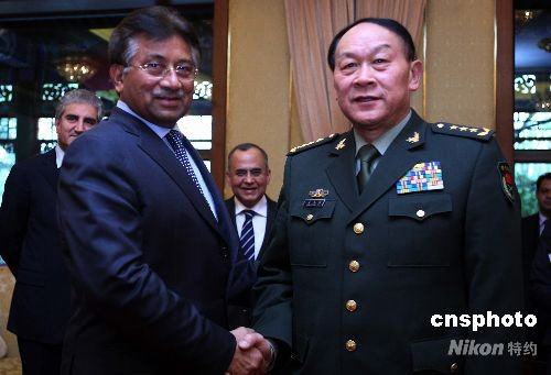 4月14日,中國國務委員兼國防部長梁光烈上將,在北京釣魚臺國賓館會見正在中國進行國事訪問的巴基斯坦總統穆沙拉夫。中新社發 宋吉河 攝